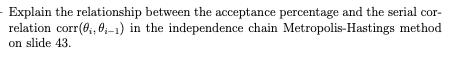 How can the acceptance percentage and the serial correlation in the sequence of draws be used to evaluate whether a candidate distribution is good or bad in the independence chain Metropolis-Hastings method?