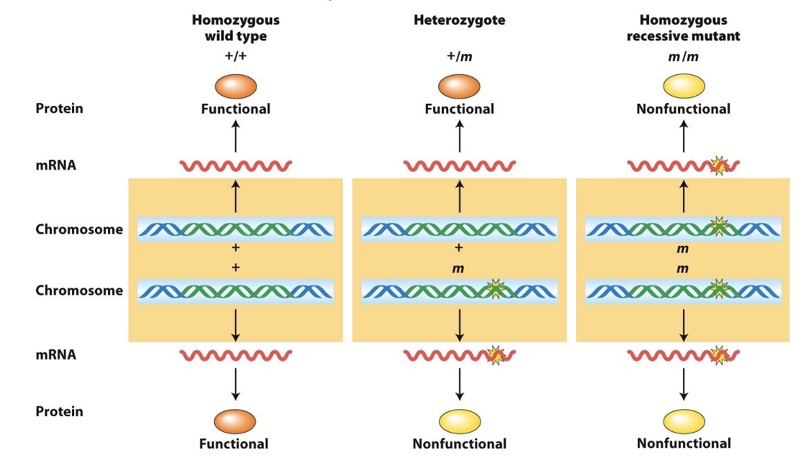 One possible molecular mechanism for how a dominant allele, given the designation of “+” (for wild type) masks (or covers) the recessive allele.