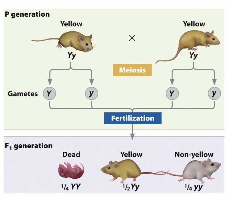 The ____ yellow coat color mutant allele in mice, also acts as a lethal when _____.