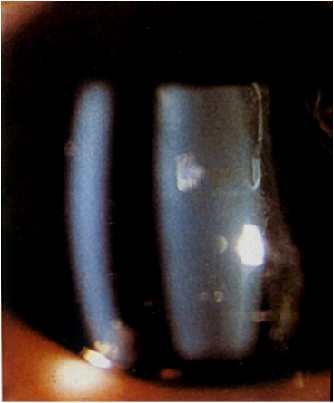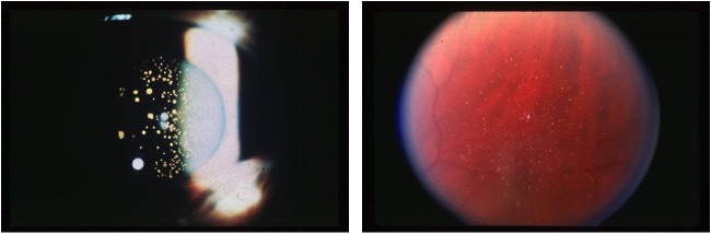 common benign finding in >50 y/o (90% unilateral) = yellow-white spheres of calcium lipids adhering to vitreous framework