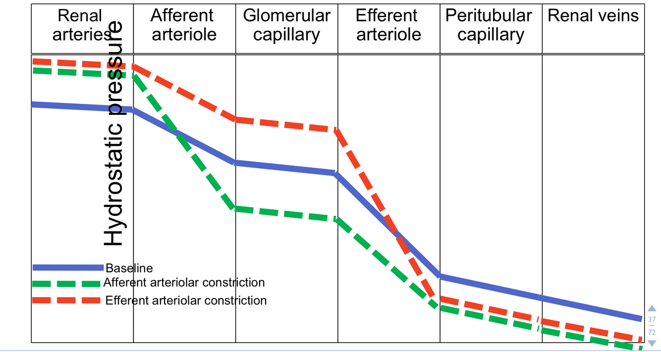 Afferent arteriolar constriction–> big drop in hydrostatic pressure at the afferent arteriole and smaller, big big drop at the efferent arteriole .