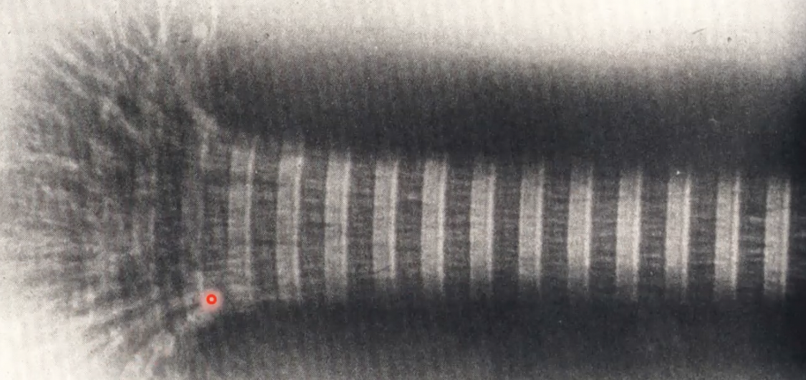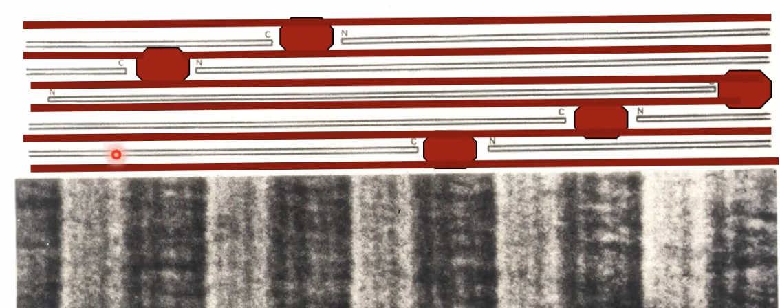 type 1 collagen molecules form head to tail and have spaces in between that form “hole zone”, gives stripped appearance