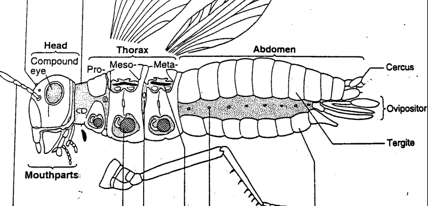 Third part is the abdomen. At the end of abdomen there are the cercus and ovipositor. Top part of abdomen is tergite and bottom part is sternite.