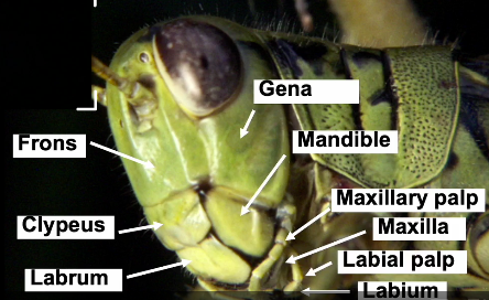 We have frons in the where nose should be. Below that is the Clypeus then Labrum. Gena Is kind of where the cheeck is and manibles below that. Next the Maxillary palp, Maxilla, Labial palp and Labium in that order going down below mandible.