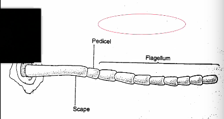 Looking at at the antennae, it starts with the scape, then pedicel, then at the end of antennae is a whole bunch of pedicel which we call flagellum. Many types of antennae