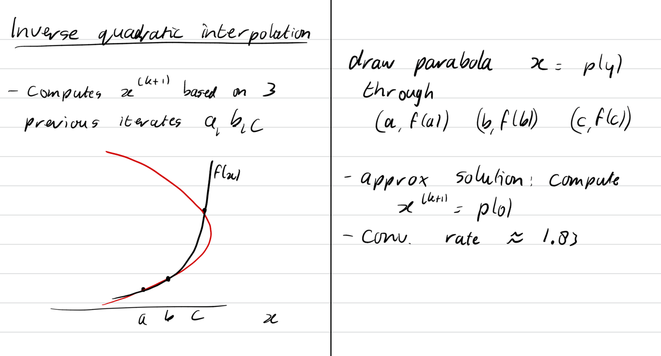 What is the Inverse Quadratic interpolation (root finding)? What is its rate of convergence?