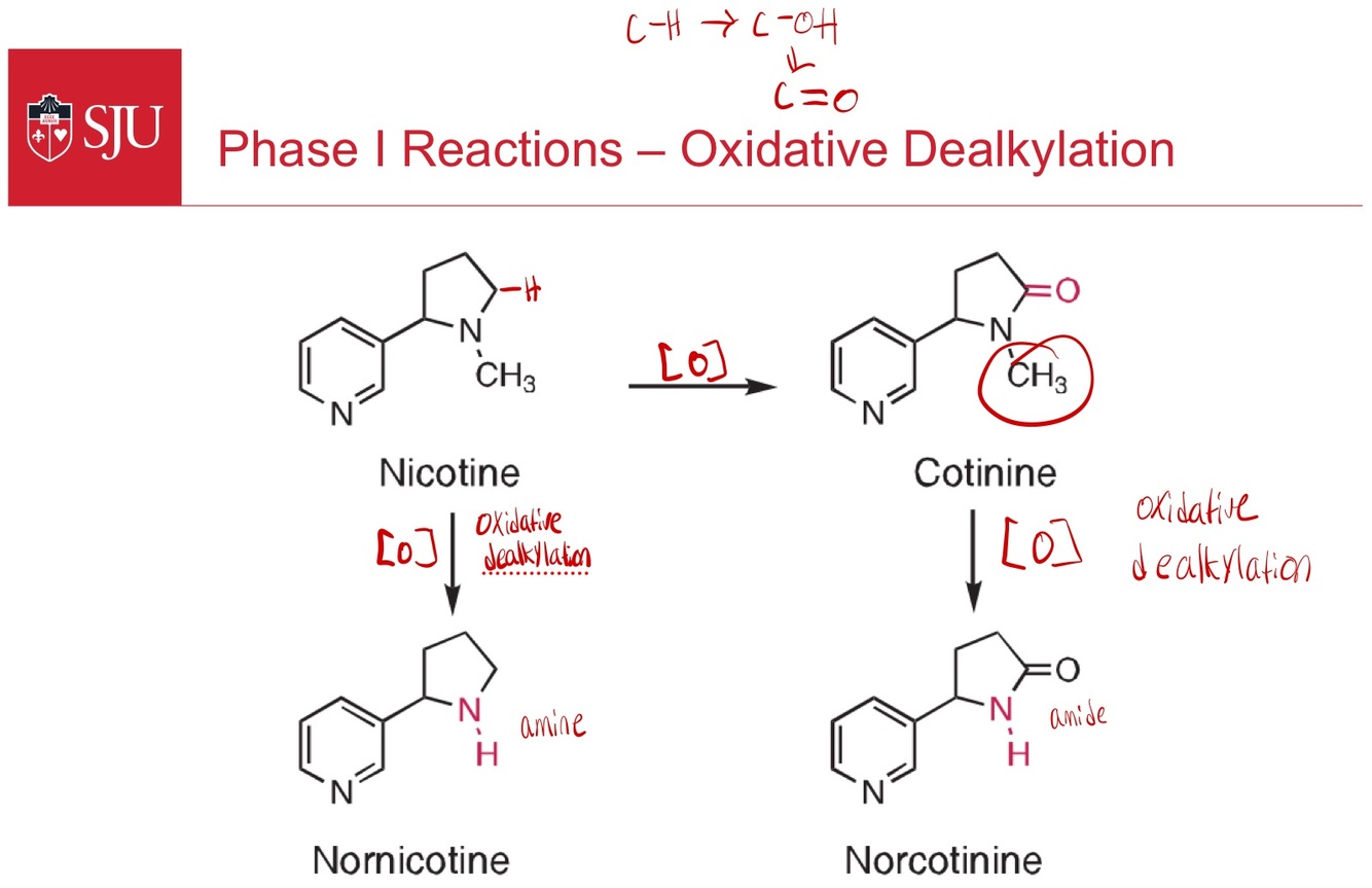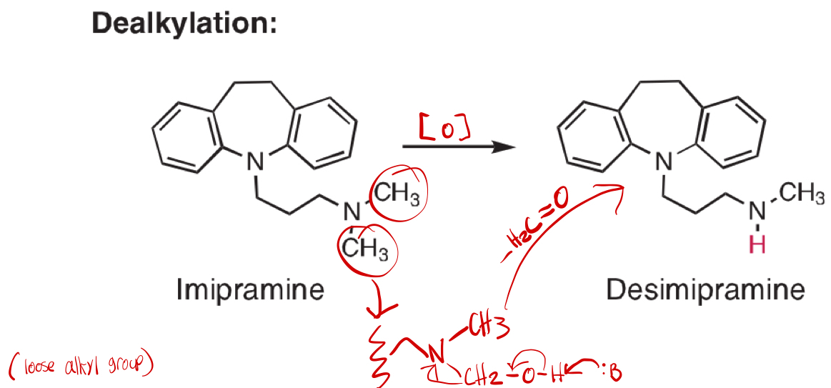 you basically lose and akyl group (-CH3) and it attaches a hydrogen