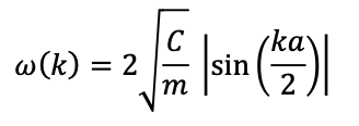 Give the equation for the dispersion relationship for vibrations of a monatomic 1D chain of atoms with nearest neighbour harmonic forces