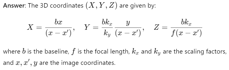 Write the formula for calculating 3D coordinates from disparity in stereo vision.