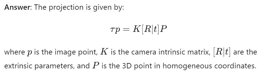 What is the formula for the projection of a point in 3D space onto an image plane?