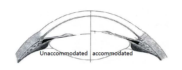 When the eye focuses at near object or during accommodation the ciliary muscle contracts and the zonule is slackened and the lens curvatures changes causing light to focus on the retina.