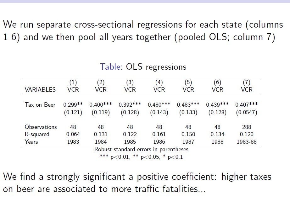 Given a positive regression coefficient should we conclude that a reduction in taxes on beer would reduce lethal car accidents? Why or why not?