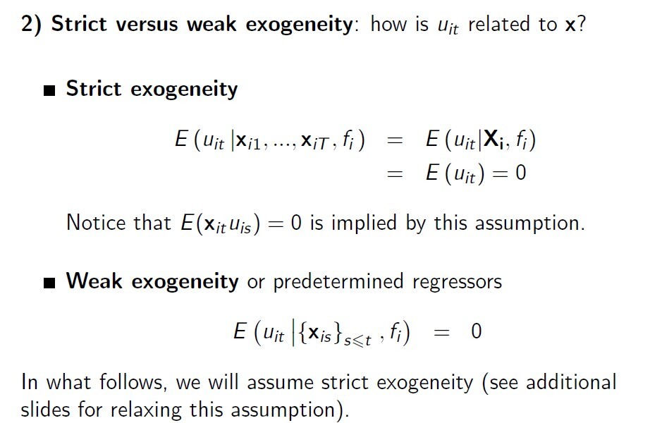 Explain strict versus weak exogeneity? How is u^-(it) related to x?