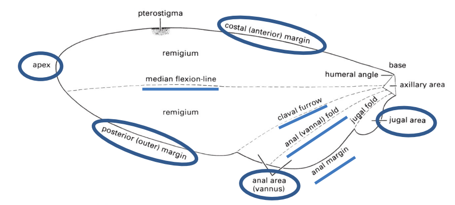 Middle line is median flexion line, then claval furrow line, then anal fold line, and anal margin. Then theres that outside ridge parts, starts with costal margin from the top, then apex, posterior margin, anal area, and jugal area at the bottom.