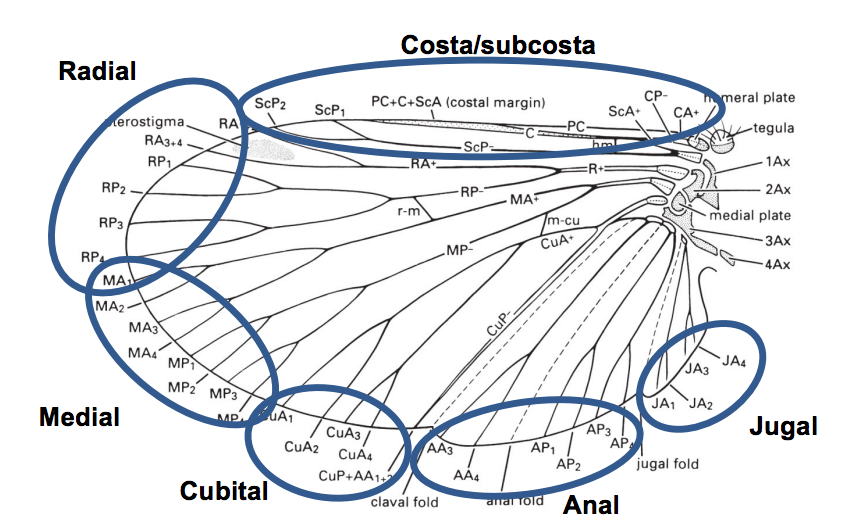 Costa, then radial, then medial, then cubital, then anal, then jugal