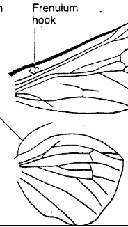 Row of bristles at the front edge of hind wing and hook in forewing. Frenulum connects hind wing and forewing to make wings act as single surface. Seen in Lepidoptera and in Hymenoptera (bees and wasps).