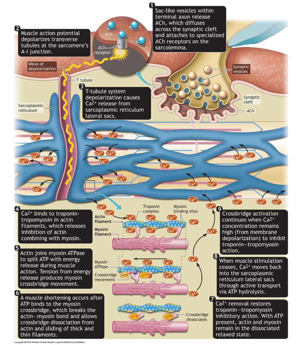 (4) Ca2+ binds to troponin in actin filaments and tropomyosin (“rope”) moves away from the binding sites on actin