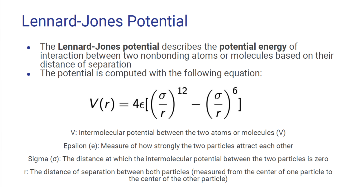 The Lennard-Jones potential describes the potential energy of interaction between two nonbonding atoms or molecules based on their distance of separation