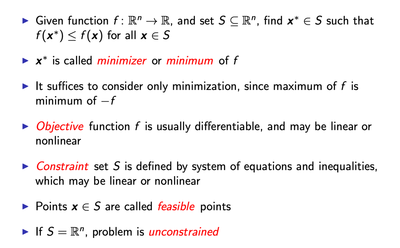 What is the main idea behind optimization? What is an objective? What is an constraint?