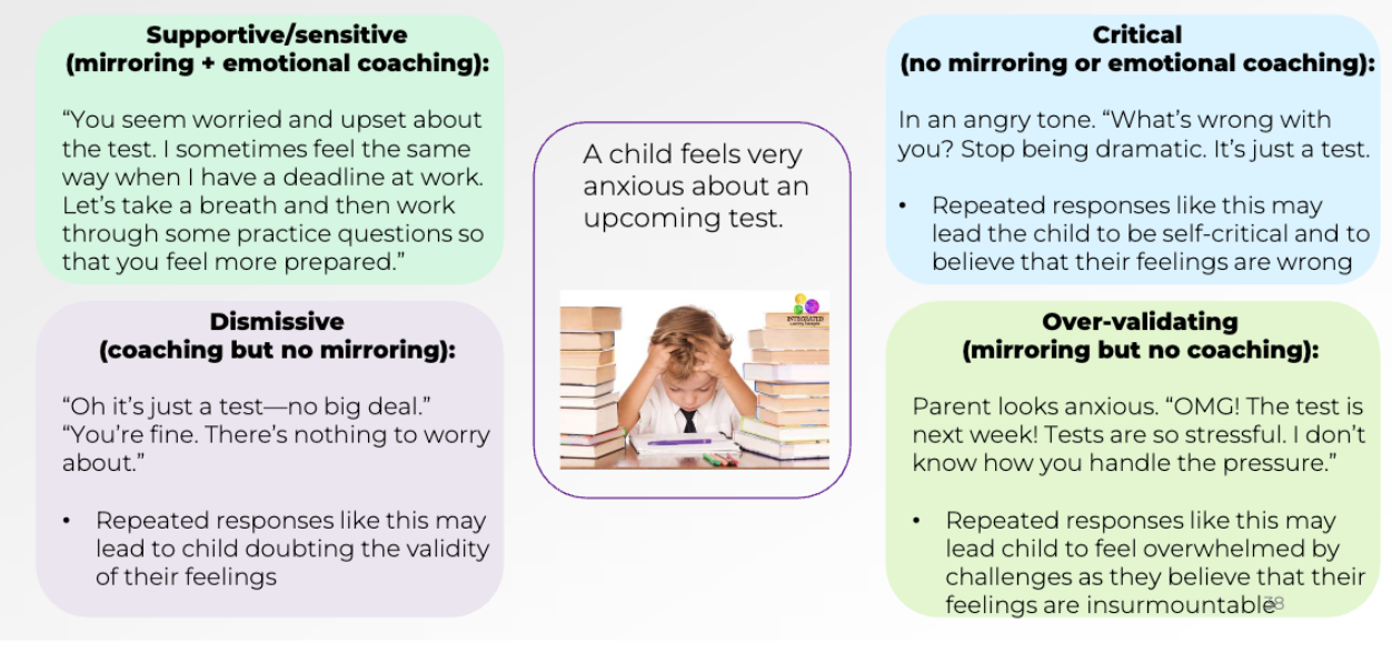 Supportive/sensitive reactions, characterized by mirroring + emotional coaching, is ideal way to react to children’s emotions: