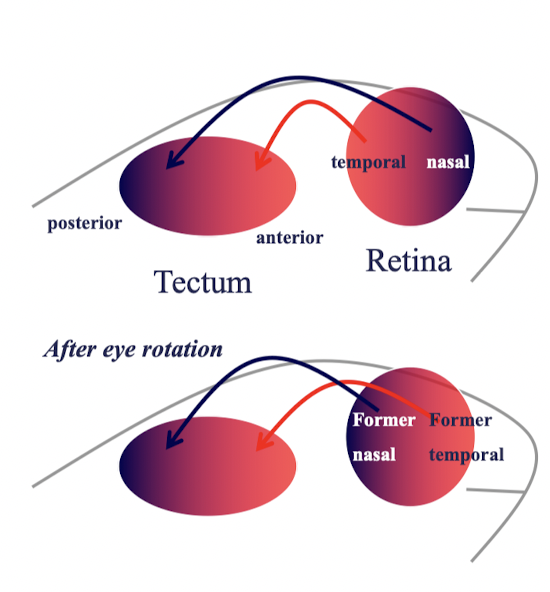 -the posterior tectum is wired for you to stick you tongue out so when the eye is rotate the projections are still the same but the frog cannot stick tongue out