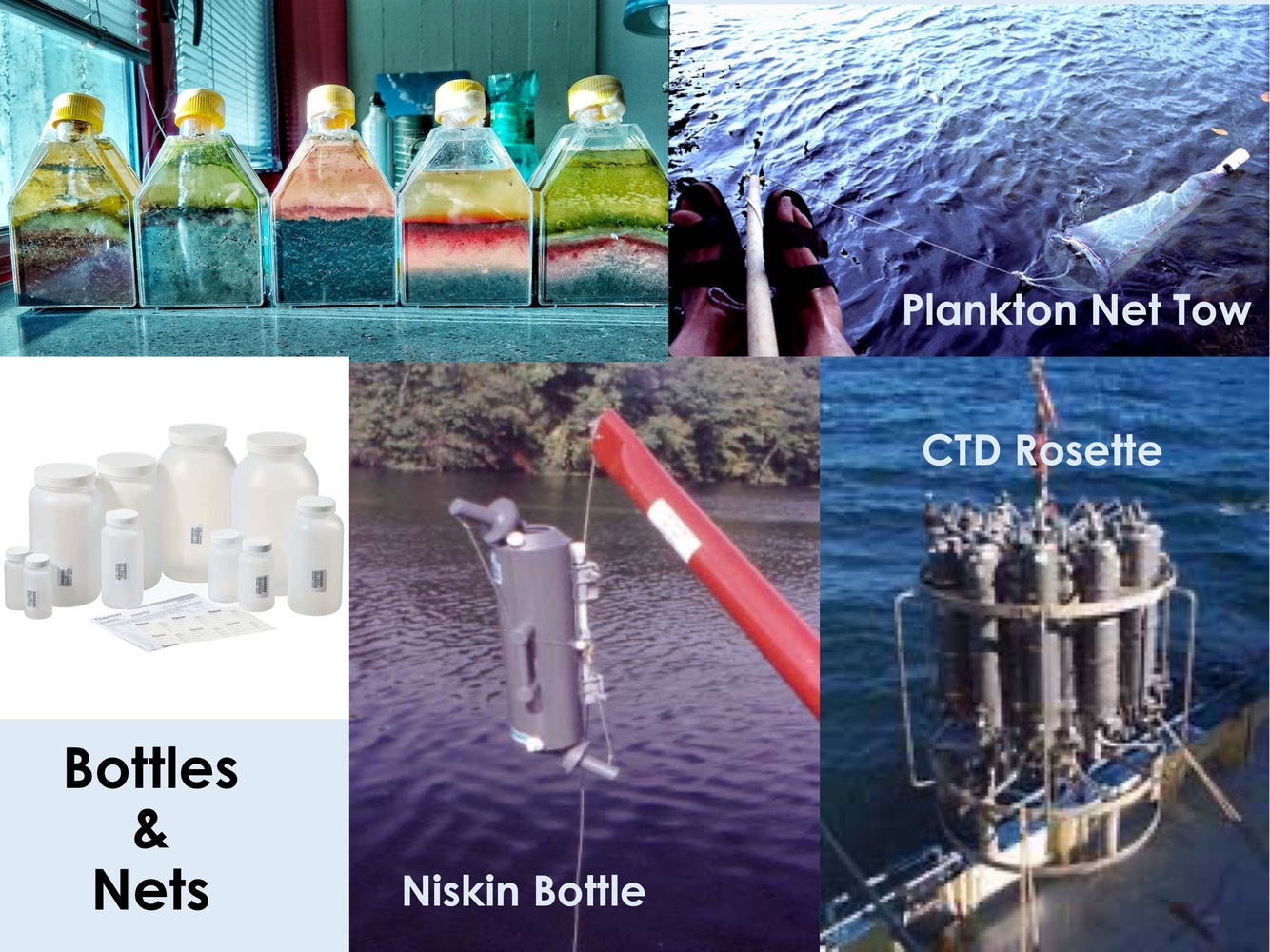 What are some bottles and nets used in aquatic sampling? When would you use each one?