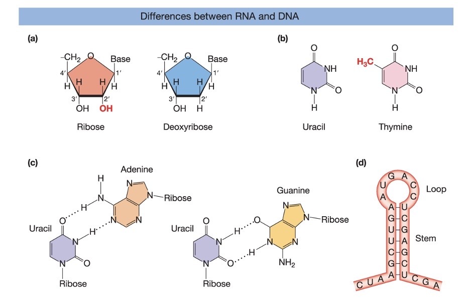 2) uracil replaces thymine (lacks a methyl group) can be bound to both adenine and guanine