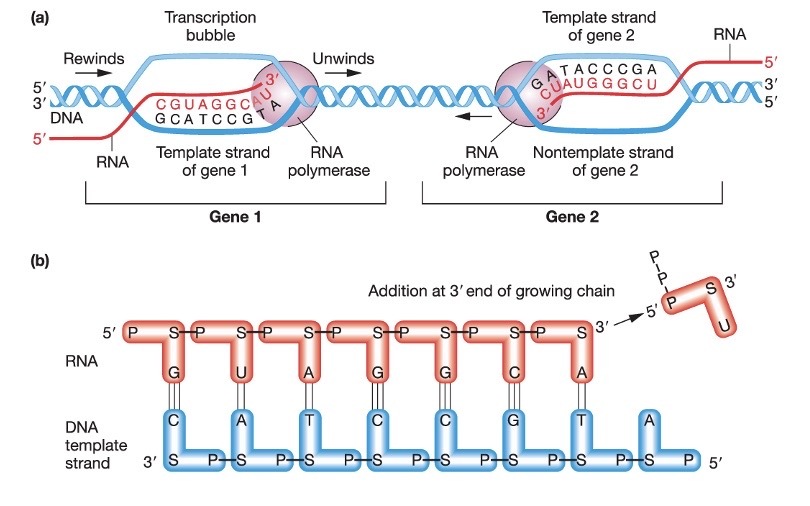 DNA’s 3’ to 5’. Each new RNA base attaches on the 3’ end of the RNA.