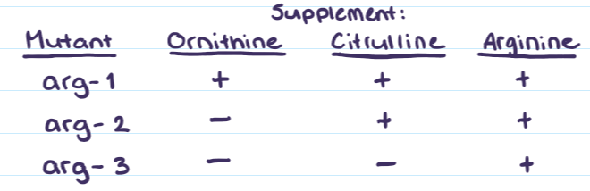 arg-2: doesn’t grow when supplementing with ornithine so mutation must be downstream of ornithine but upstream of citrulline