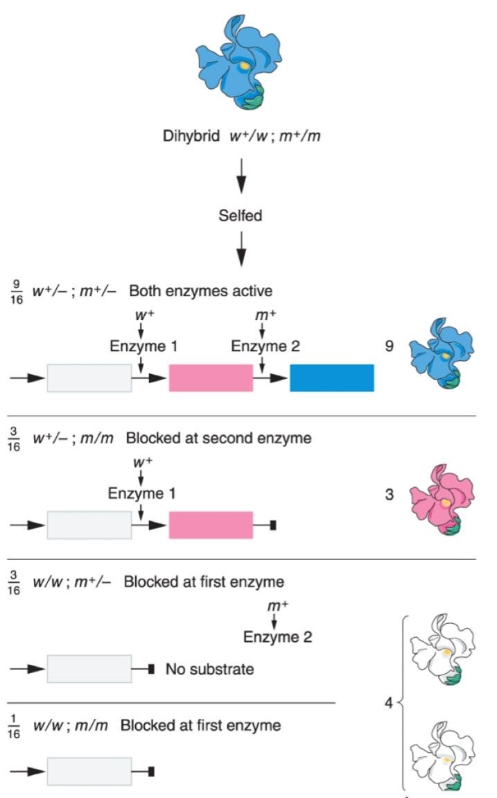 if progeny of white mutant flower crossed with blue WT flower are crossed, what is the ratio we expect if the white mutation occurs in 1 gene only?