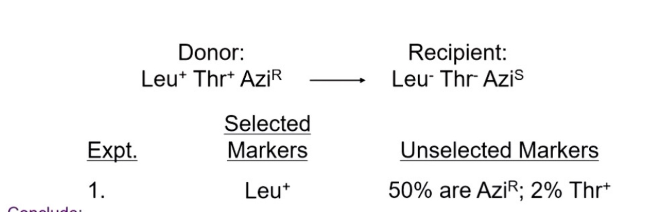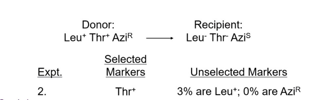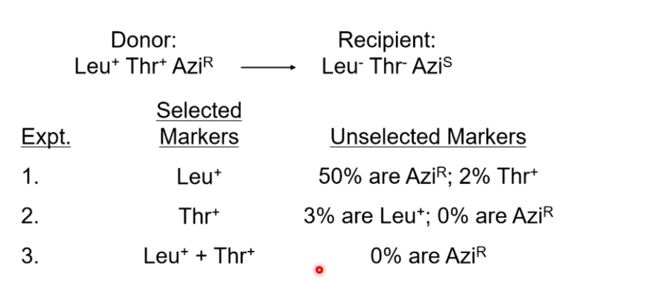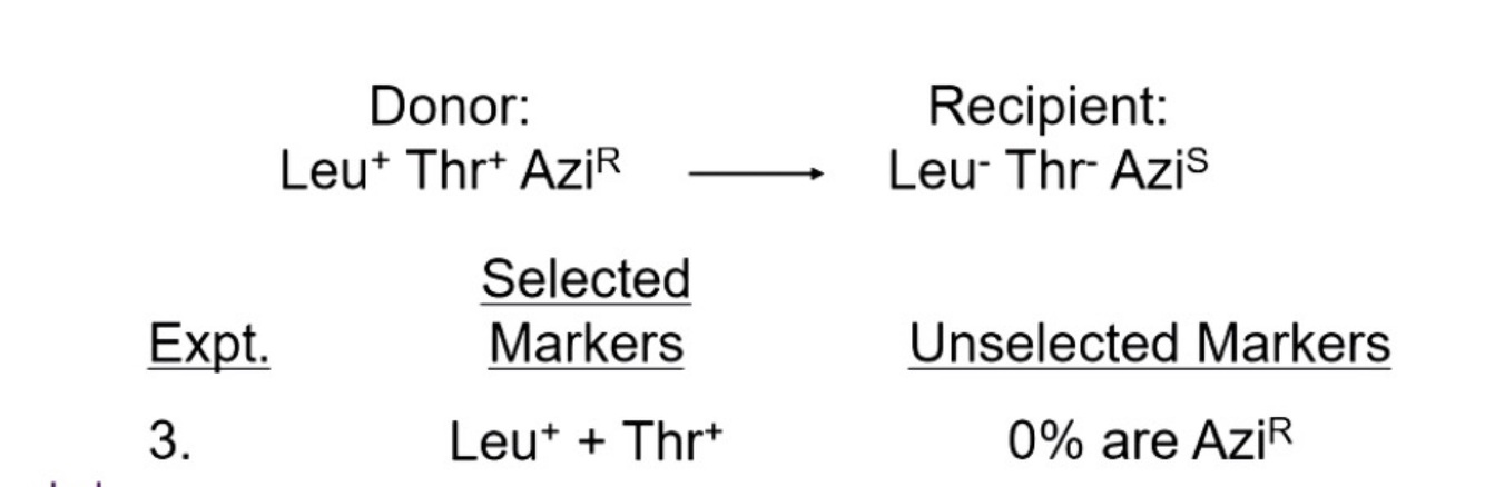 If you select for Leu plus Thr, Azi is never co-transduced. Confirms that the distance between Thr and Azi is greater then 90 kb