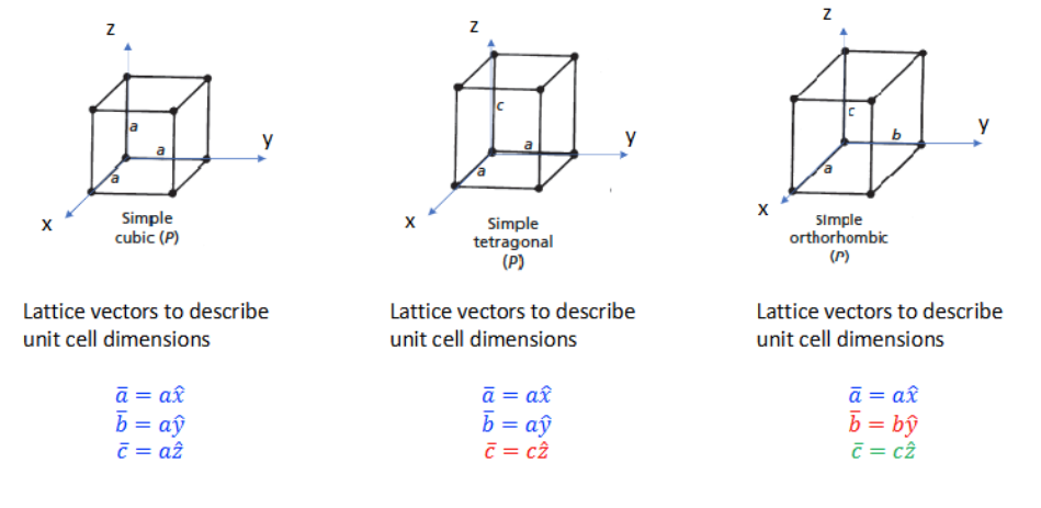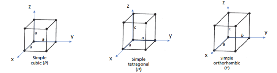 simple cubic, simple tetragonal, simple orthorhombic (all same l, 2 same l, 3 dif)