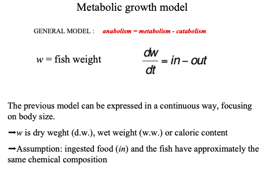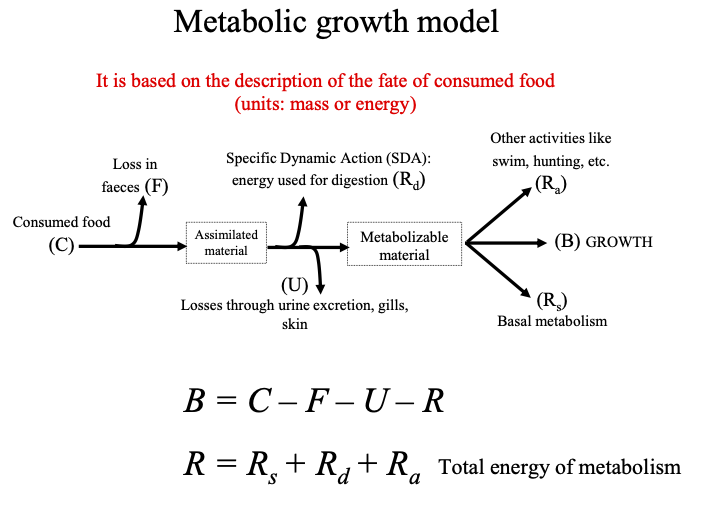 It describes how consumed food (C) is used for growth (B) after losses such as feces (F), excretion (U), and metabolic costs (R). Formula: B = C - F - U - R.
