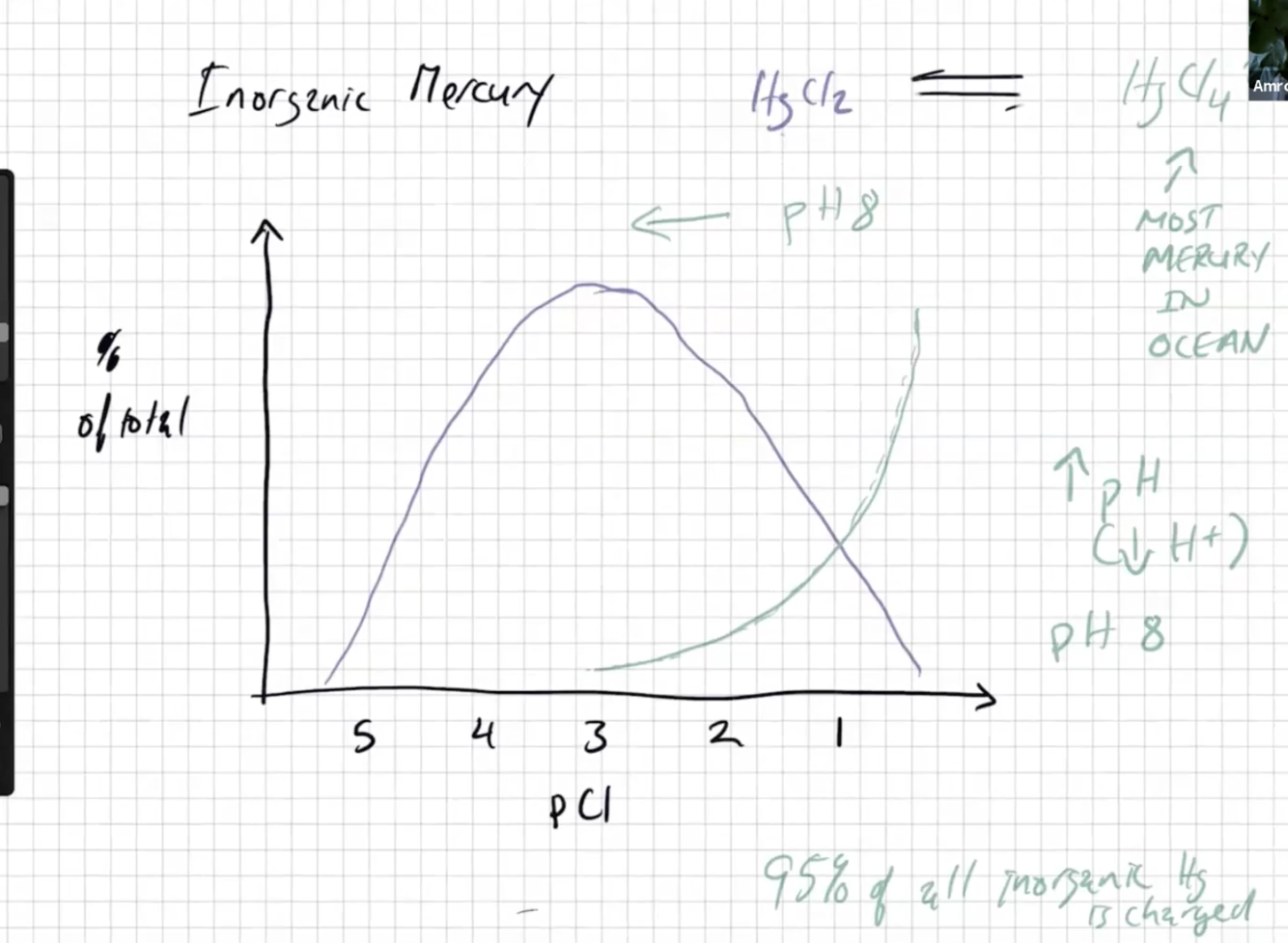 lower pH means more H+ present, attracts Cl- ions so there is less available Cl. This pushes the equilibrium from HgCl4 2- to HgCl2, as there is less Cl to react with the Hg