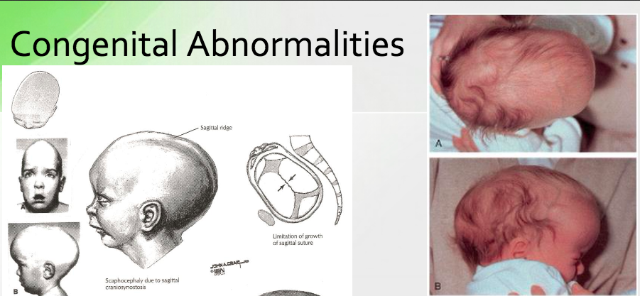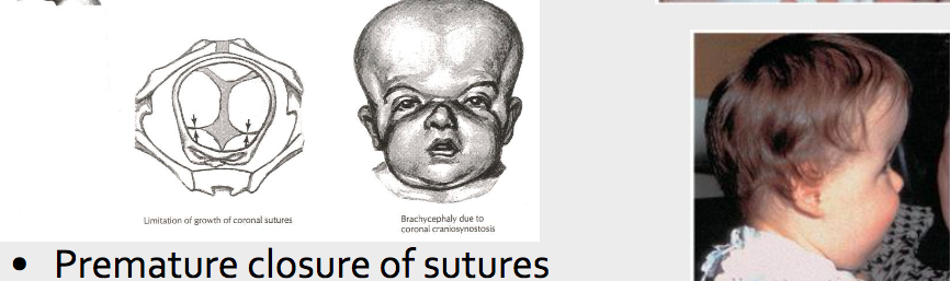 Premature closure of sagittal suture —> cranium becomes long, narrow, and wedge shaped