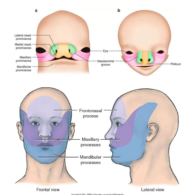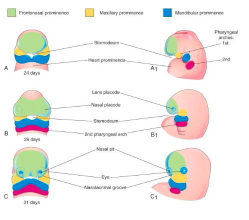 Step 2: differentiation of frontonasal prominence into: nasal placode, medial/lateral nasal prominence, nasolacrimal groove