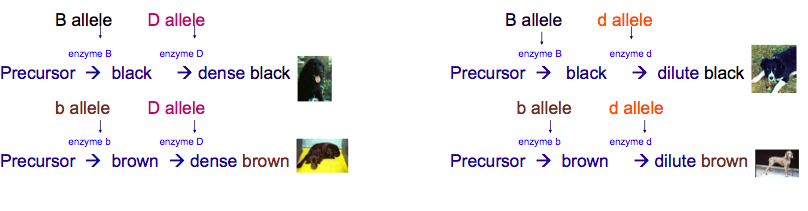 What are the biochemical pathways in gene interaction? (coat colour Bb and coat Dd=dense/diluted)