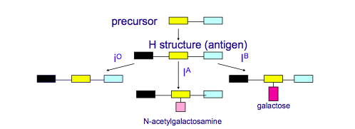 If have only IO than H structure stays as it is if IA then add N-acetylgalactosamine(sugar) to H and IB add galactose to H structure