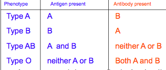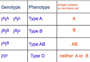 What are the possible genotypes for blood groups A, B and O and AB? And the antigenon the surface of the cell?