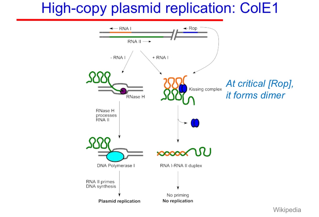 In presence of Rop (Rom) protein, RNA I binds to RNA II and prevents it binding to oriV à replication stops