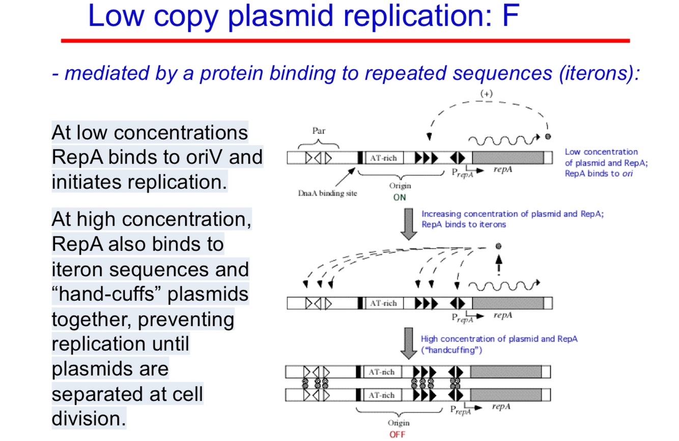 At high concentration, RepA also binds to iteron sequences and “hand-cuffs” plasmids together, preventing replication until plasmids are separated at cell division.