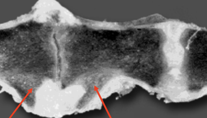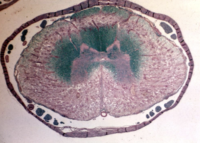 staining of myelin supportive of degenerative myelopathy (should be completely blue in white matter)