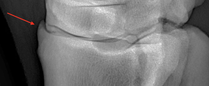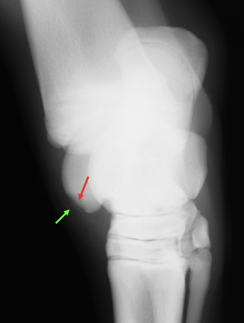 -red arrow is pointing to normal variation of the medial trochlear ridge