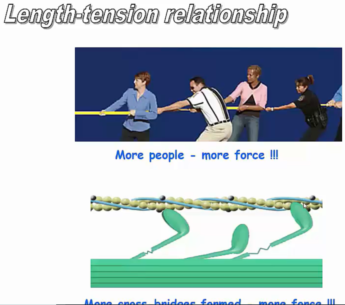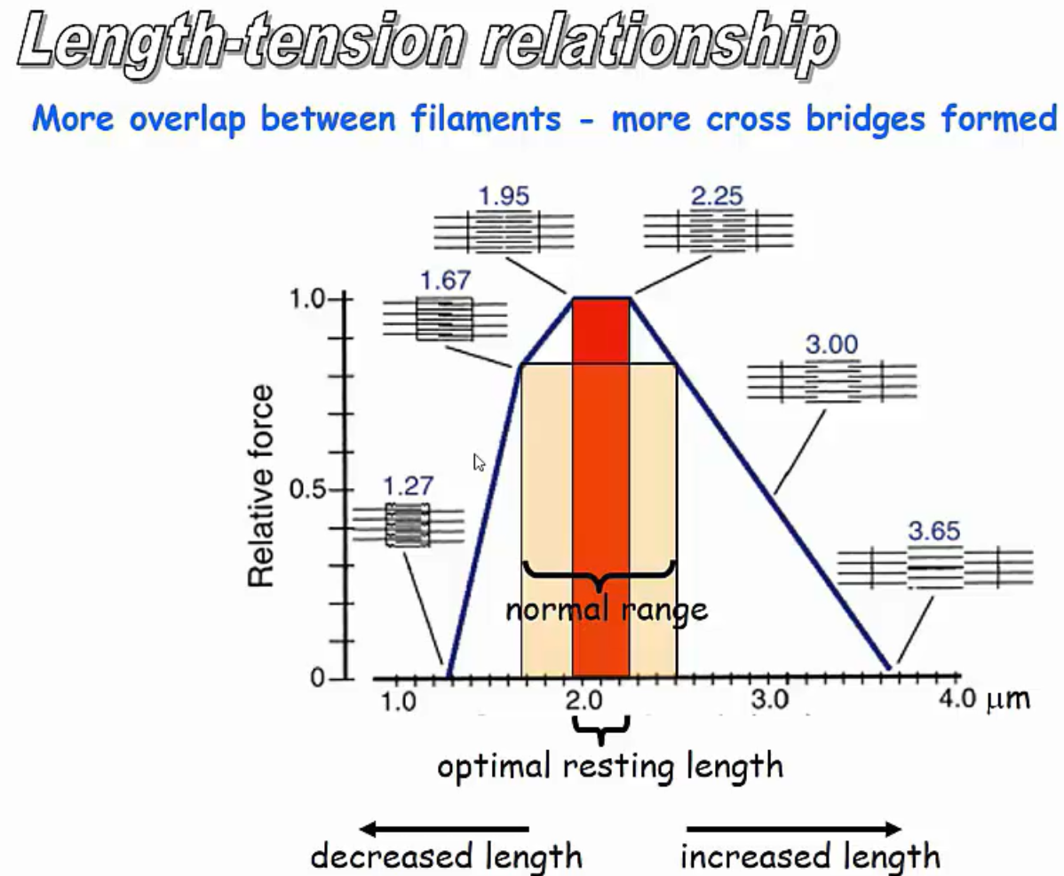 There is an optimal length for maximum number of cross-bridges to form. The more cross-bridges form, the greater the tension/force of contraction of the muscle. For skeletal muscle, this optimal length is a resting sarcomere, which is about 2-2.2 microns.