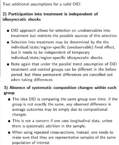 What are the two additional assumptions for a valid DiD? (apart from the parallel trend assumption)?