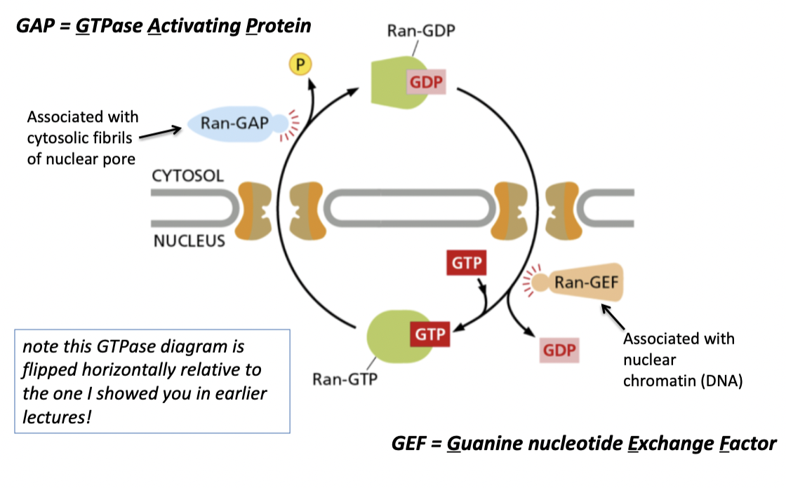 Ran-GEF -> associated with nuclear chromatin (DNA); inside of nucleus -> exchanges Ran-GDP and attaches Ran-GTP
