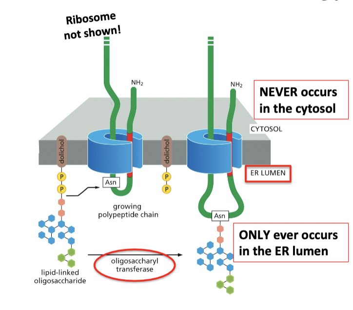 called “N-linked” glycosylation because the sugar chain is attached to Nitrogen on the asparagine side-chain; only occurs in the ER lumen