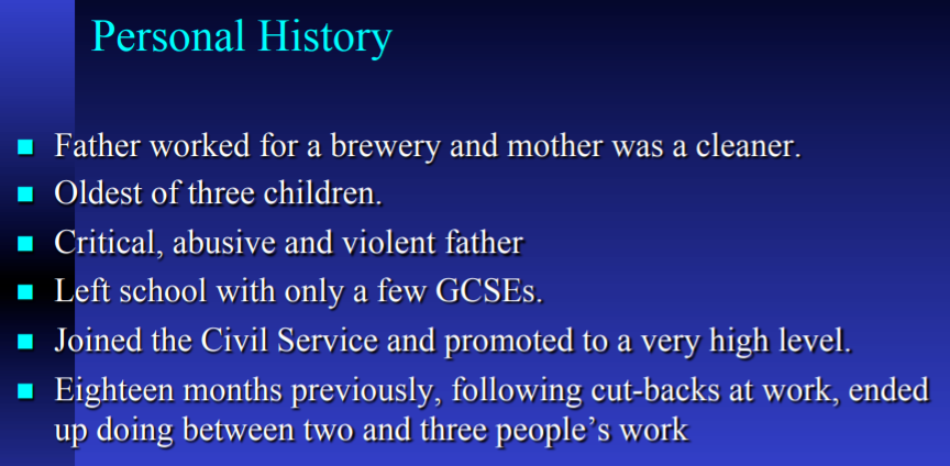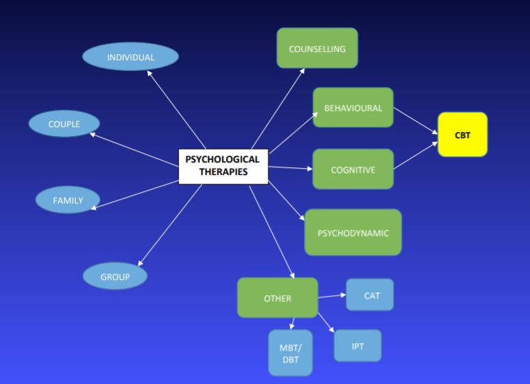 **PTSD** - ‘reliving’ trauma EMDR (Francine Shapiro) **OCD** - CBT incorporates Exposure and Response Prevention (ERP) **Bulimia Nervosa –** CBT /IPT **Anorexia Nervosa –** In patient weight gain prog. CBT/ IPT/ CAT **Borderline** – Schema focussed CBT, DBT (Marsha Linehan), Mentalization (Fonagy) **Anti-social** - Group based CBT **Schizophrenia** - NICE guidance is CBT and family therapy