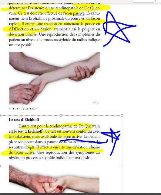 donne 2 tests spéciales que t’aimerais effectuer en dequervain et décrit les sommairement