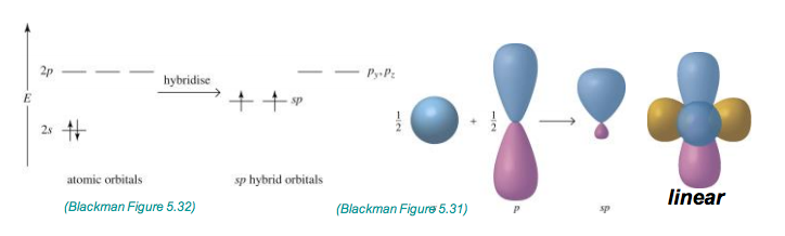 By mathematically combining the Px and s atomic orbitals, in phase and out of phase conbinations lead to two bybrid orbitals.